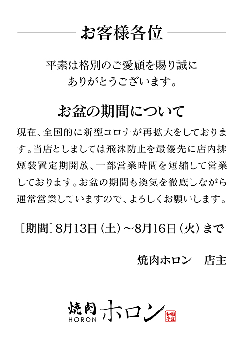 お盆の期間も換気を徹底しながら通常営業していますので、よろしくお願いします。